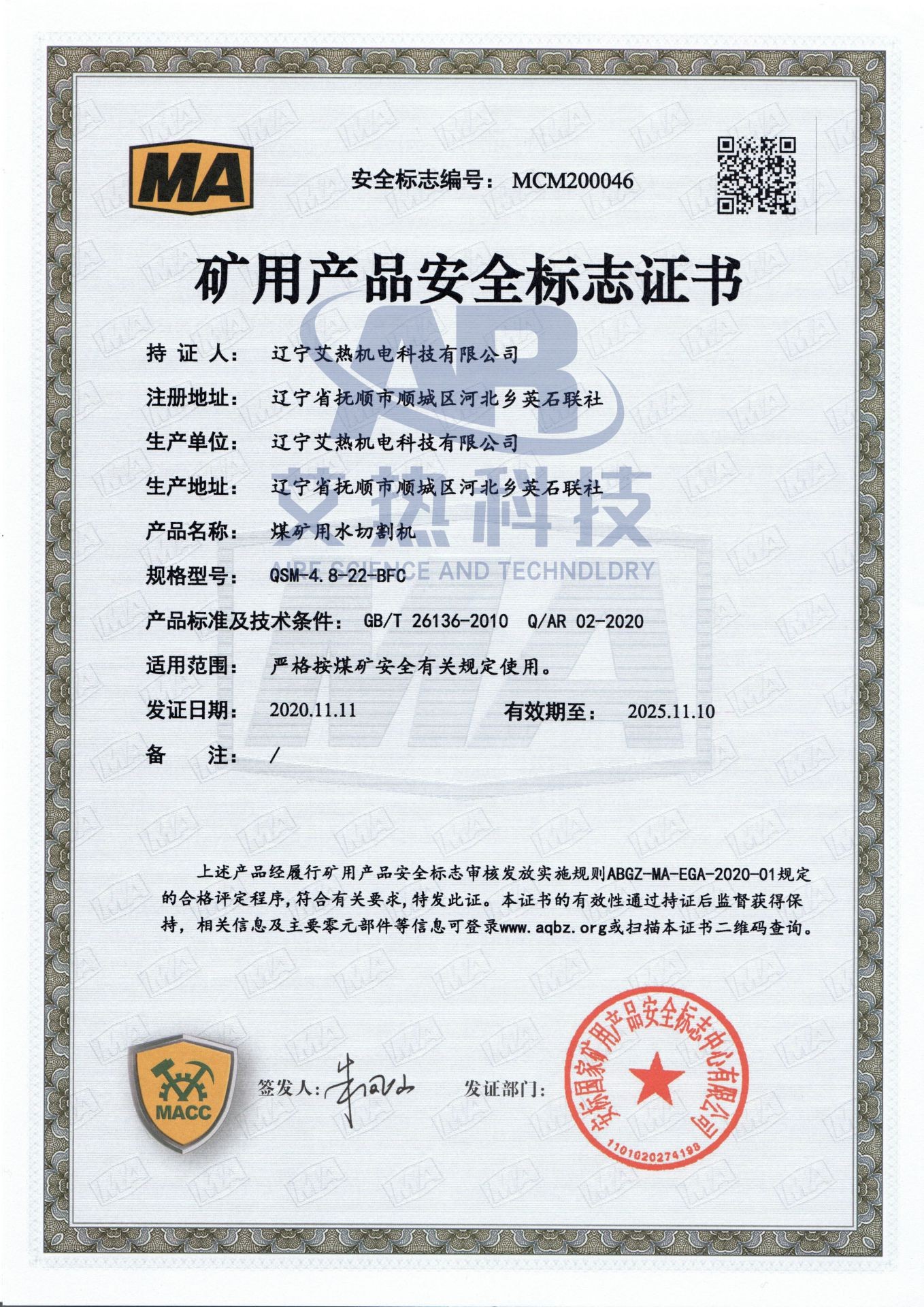 QSM-4.8-22-BFC煤礦用水切割機(jī)取得礦用產(chǎn)品安全標(biāo)志證書